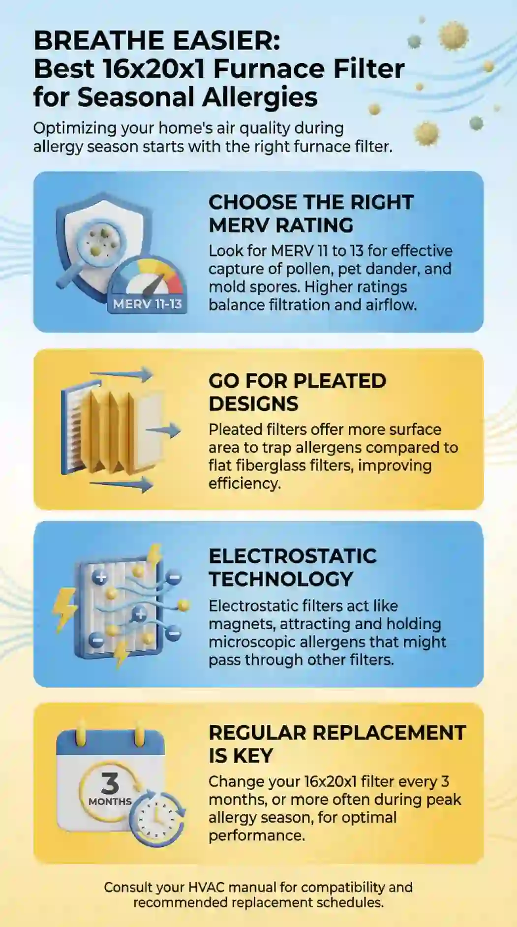 Spring Pollen Season (March-June): Install fresh MERV 8 or MERV 11 at season start, replace every 60-75 days. Tree and grass pollen loads can clog filters 40% faster than manufacturers claim based on "average" conditions.