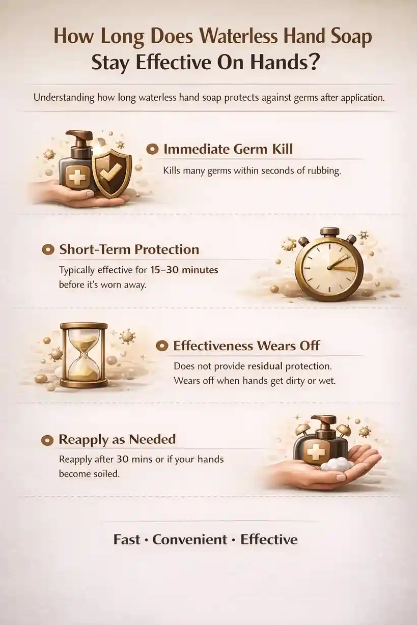 In practical settings, waterless hand soap remains effective until hands are re-contaminated. There is no fixed time window. The moment hands touch surfaces, food, equipment, or moisture, effectiveness begins to decline. This is why professionals view waterless hand soap as event-based hygiene, not time-based protection.