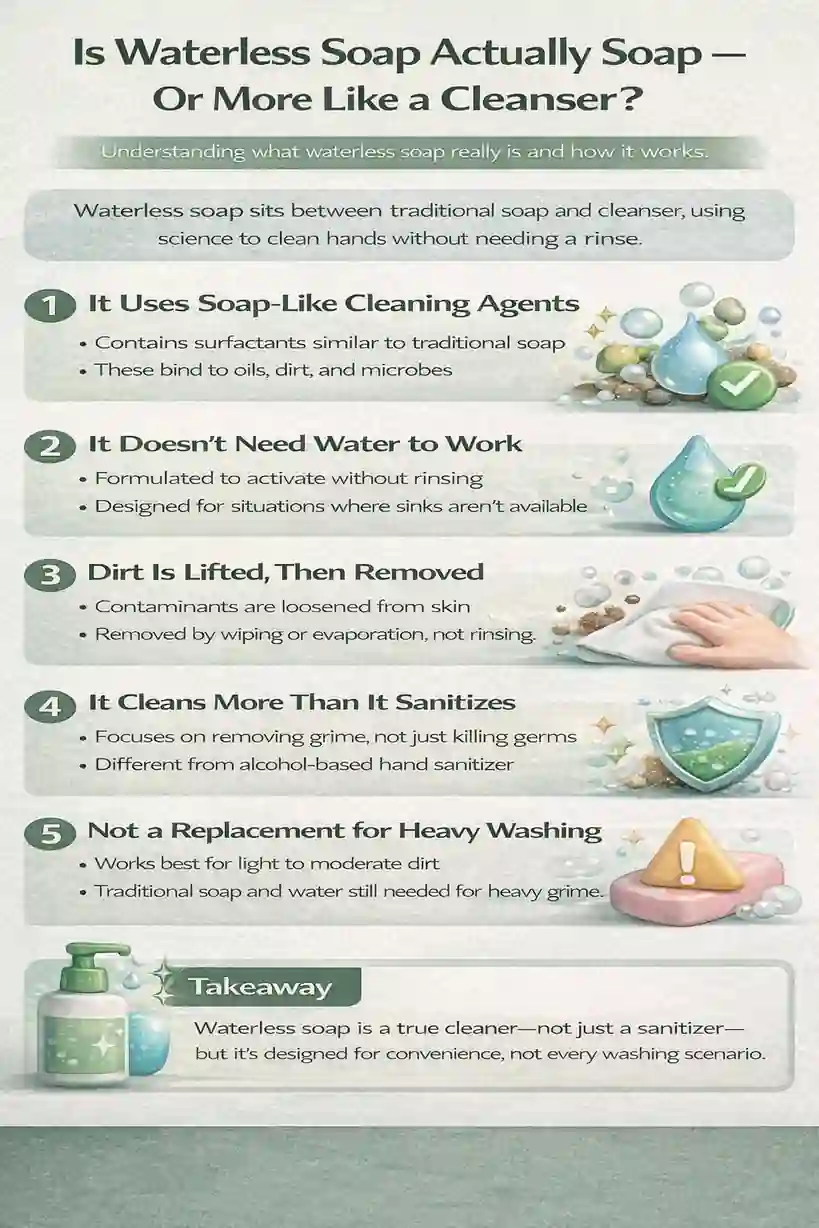Waterless soap is a no-rinse cleanser designed to clean hands or skin without running water. Based on real-world use, it works by lifting oils, dirt, and germs so they can be wiped away, making it practical for travel, outdoor use, and quick cleanups. It’s best used as a complement to traditional soap and water, not a full replacement.